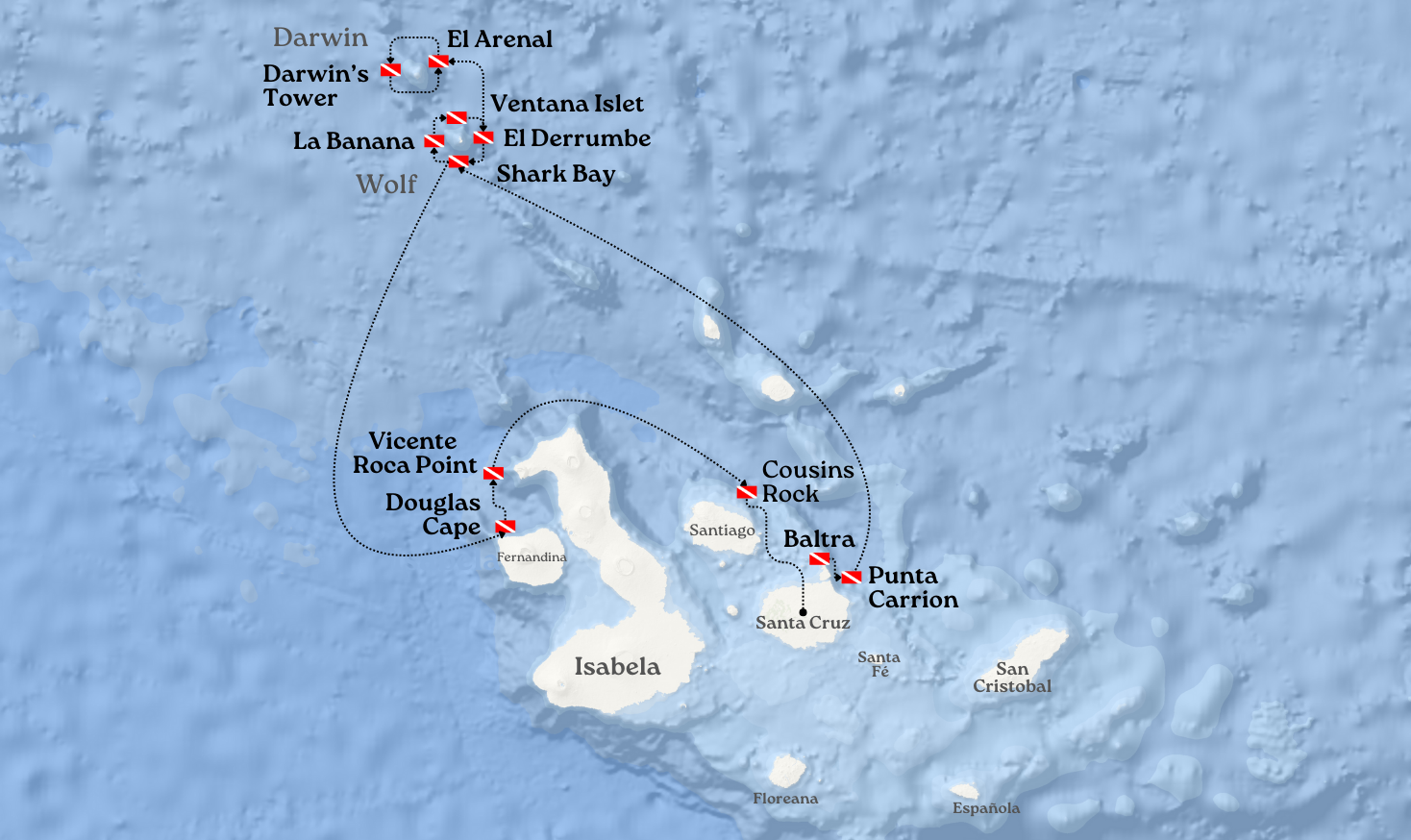 Embark on an 8-day diving adventure through the pristine waters of the Galápagos Marine Reserve, visiting iconic sites in the Darwin & Wolf Marine Sanctuary. Experience multiple dives each day, with shark-filled channels and playful encounters with sea lions and vibrant tropical fish. With luck, encounter the giants of the ocean — whale sharks — gliding gracefully through these rich waters. Along the way, enjoy warm onboard meals, expert guidance from our dive masters, and breathtaking scenery above and below the surface, making every moment an unforgettable part of your journey.