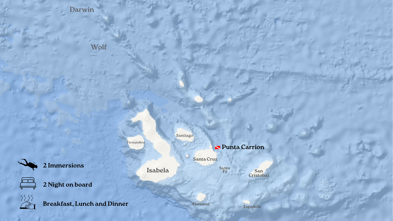 Before heading to the northern islands, we start with a check dive at Baltra Northeast (1 immersion) to refresh our skills and test all equipment in the water. With clear conditions and the first glimpses of Galapagos marine life, it is the perfect start to an unforgettable expedition.