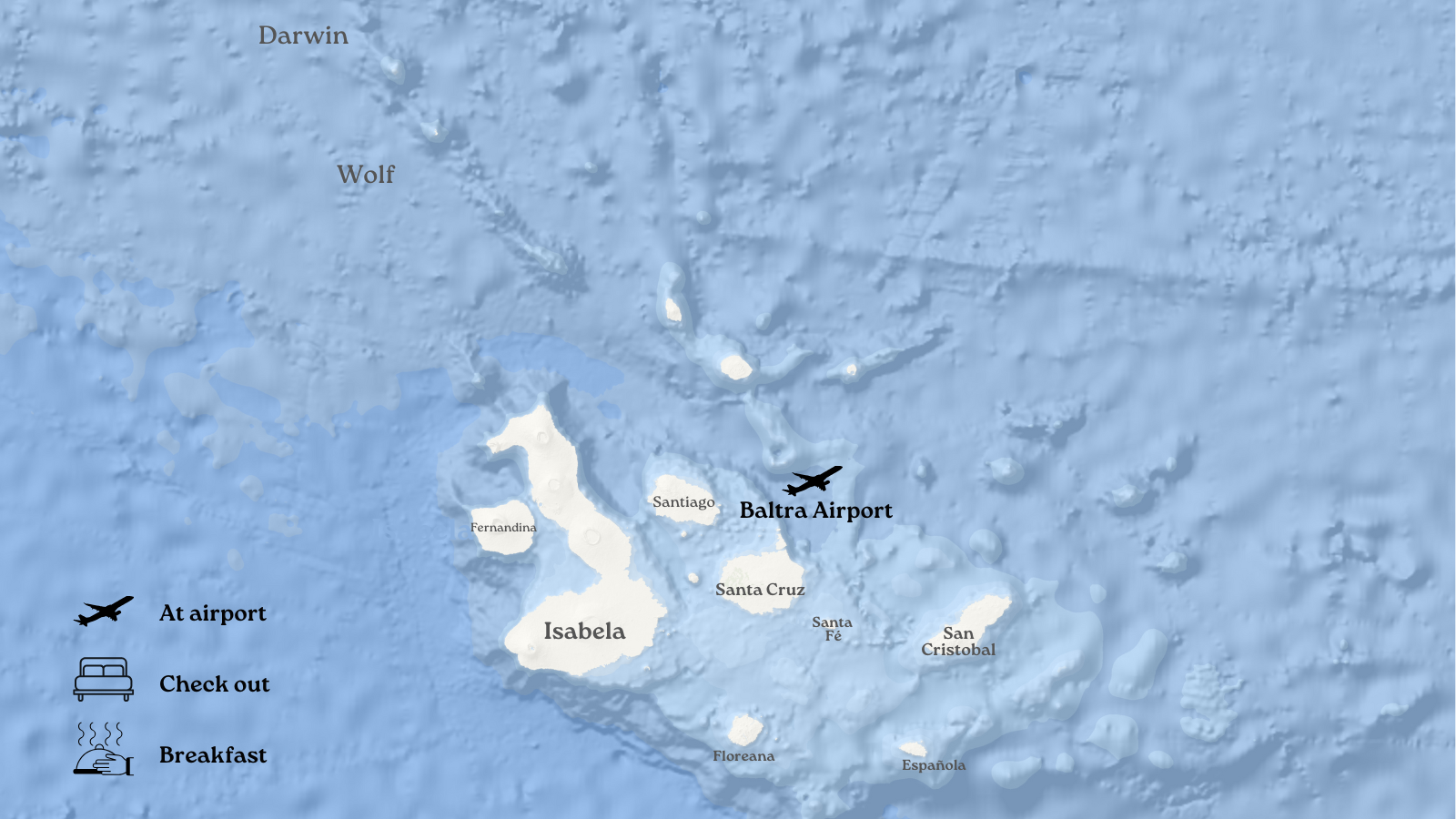 The map below gives you an overview of the route, starting from Santa Cruz Island (Baltra) and navigating through the Galapagos Marine Reserve. To complete the journey, the last day includes a special visit to see the iconic giant Galapagos tortoises before returning to the airport.