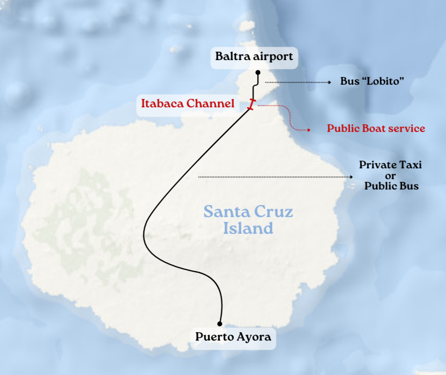 To cross to Santa Cruz Island, take the public ferry for $1 USD. Once on the island, you can choose between a private taxi (approximately $30 USD, 45 minutes to Puerto Ayora) or a public bus for $5 USD. Please note, public buses depart once they are full.